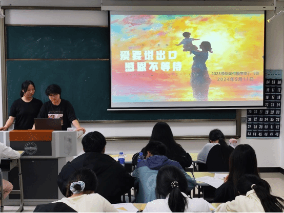 “同學(xué)們,猜一猜明天是什么節(jié)日啊?”“母親節(jié)!”5月11日,新聞傳播學(xué)類專業(yè)2023(7)、(8)班在K202教室開展以“愛要說出口,感恩不等待”為主題的團建活動。活動開始前,活動負責人、新聞傳播學(xué)類專業(yè)2023(7)、(8)班的班長楊雨霏、朱研溪提前為每位同學(xué)準備好信紙和信封。朱研溪說:“我們希望通過寫信這種傳統(tǒng)而深情的溝通方式,讓同學(xué)們勇敢表達自己的心聲,將對母親的愛訴說于筆尖。”學(xué)生們觀看一段關(guān)于母愛的感人短片后,...